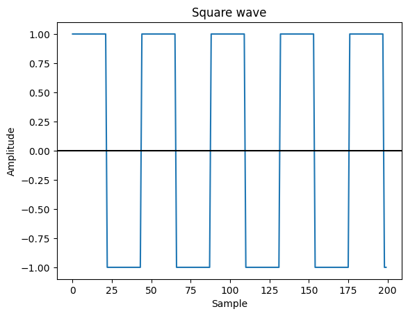 The basic idea is that we're going to start by keeping the state of a square wave. A square wave just alternates between a high value and a low value every cycle. Because it will be convenient later on, we choose 1 for the high value, and -1 for the low value. The code then switches between those states by keeping track of our current position in the wave (the number of samples processed so far), and flipping the sine of our square_state variable every time the position advances by half_cycle_samples places.
